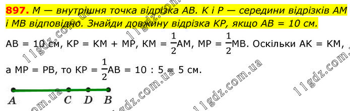 М — внутрішня точка відрізка AB. K і P — середини відрізків AM і MB відповідно. Знайди довжину відрізка KP, якщо AB = 10 см. AB = 10 см, KP = KM + MP, КM = 1/2AM, MP = 1/2MB. Оскільки AK = KM, a MP = PB, то КP = 1/2AB = 10 : 5 = 5 см.