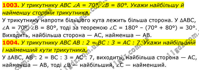 1003. У трикутнику ABC ∠A = 70°, ∠B = 80°. Укажи найбільшу й найменшу сторони трикутника. У трикутнику напроти більшого кута лежить більша сторона. У ∆ABC, ∠A = 70°, ∠B = 80°, тоді за теоремою ∠C = 180° – (70° + 80°) = 30°. Виходить, найбільша сторона — AC, найменша — АВ. 1004. У трикутнику ABC AB : 2 = BC : 3 = AC : 7. Укажи найбільший і найменший кути трикутника. У ∆ABC, AB : 2 = BC : 3 = AC : 7, виходить, найбільша сторона — AC, найменша — AB, тоді ∠B — найбільший, ∠C — найменший.