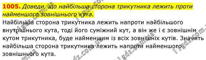 Доведи, що найбільша сторона трикутника лежить проти найменшого зовнішнього кута. Найбільша сторона трикутника лежить напроти найбільшого внутрішнього кута, тоді його суміжний кут, а він же і є зовнішнім кутом трикутника, буде найменшим із всіх зовнішніх кутів. Значить найбільша сторона трикутника лежить напроти найменшого зовнішнього кута.