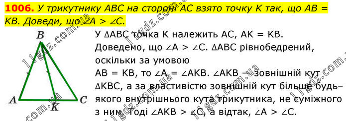У трикутнику ABC на стороні AC взято точку K так, що AB = KB. Доведи, що ∠A > ∠C. У ∆ABC точка K належить AC, AK = KB. Доведемо, що ∠A > ∠C. ∆ABC рівнобедрений, оскільки за умовою AB = KB, то ∠A = ∠AKB. ∠AKB — зовнішній кут ∆KBC, а за властивістю зовнішній кут більше будь–якого внутрішнього кута трикутника, не суміжного з ним. Тоді ∠AKB > ∠C, а відтак, ∠A > ∠C.