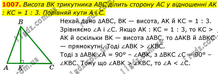Висота BK трикутника ABC ділить сторону AC у відношенні AK : KC = 1 : 3. Порівняй кути A і C. Нехай дано ∆ABC, BK — висота, AK й KC = 1 : 3. Зрівняємо ∠A i ∠C. Якщо AK : KC = 1 : 3, то KC > AK й оскільки BK — висота ∆ABC, то ∆AKB й ∆BKC — прямокутні. Тоді ∠ABK > ∠KBC. Тоді з ∆ABK ∠A = 90° – ∠ABK, з ∆BKC ∠C = 90° – ∠KBC. Тому що ∠ABK > ∠KBC, то ∠A < ∠C.