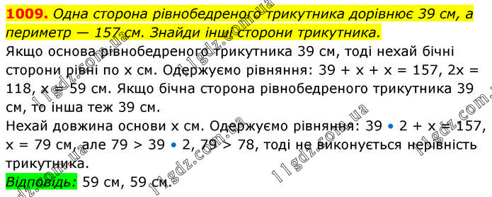Одна сторона рівнобедреного трикутника дорівнює 39 см, а периметр — 157 см. Знайди інші сторони трикутника. Якщо основа рівнобедреного трикутника 39 см, тоді нехай бічні сторони рівні по х см. Одержуємо рівняння: 39 + x + х = 157, 2х = 118, х = 59 см. Якщо бічна сторона рівнобедреного трикутника 39 см, то інша теж 39 см. Нехай довжина основи х см. Одержуємо рівняння: 39 • 2 + х = 157, х = 79 см, але 79 > 39 • 2, 79 > 78, тоді не виконується нерівність трикутника. Відповідь: 59 см, 59 см.