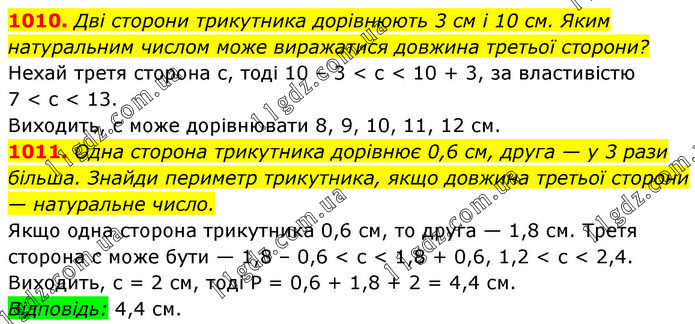 1010. Дві сторони трикутника дорівнюють 3 см і 10 см. Яким натуральним числом може виражатися довжина третьої сторони? Нехай третя сторона с, тоді 10 – 3 < с < 10 + 3, за властивістю 7 < с < 13. Виходить, с може дорівнювати 8, 9, 10, 11, 12 см. 1011. Одна сторона трикутника дорівнює 0,6 см, друга — у 3 рази більша. Знайди периметр трикутника, якщо довжина третьої сторони — натуральне число. Якщо одна сторона трикутника 0,6 см, то друга — 1,8 см. Третя сторона с може бути — 1,8 – 0,6 < с < 1,8 + 0,6, 1,2 < с < 2,4. Виходить, с = 2 см, тоді P = 0,6 + 1,8 + 2 = 4,4 см. Відповідь: 4,4 см.