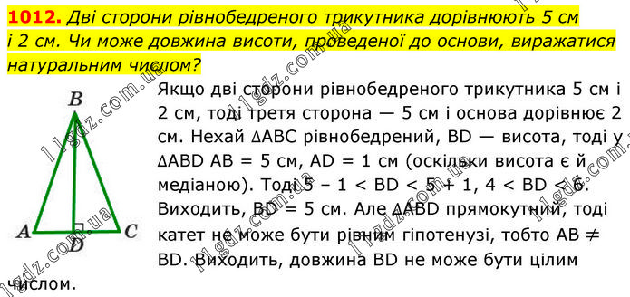 Дві сторони рівнобедреного трикутника дорівнюють 5 см і 2 см. Чи може довжина висоти, проведеної до основи, виражатися натуральним числом? Якщо дві сторони рівнобедреного трикутника 5 см і 2 см, тоді третя сторона — 5 см і основа дорівнює 2 см. Нехай ∆ABC рівнобедрений, BD — висота, тоді у ∆ABD AB = 5 см, AD = 1 см (оскільки висота є й медіаною). Тоді 5 – 1 < BD < 5 + 1, 4 < BD < 6. Виходить, BD = 5 см. Але ∆ABD прямокутний, тоді катет не може бути рівним гіпотенузі, тобто AB ≠ BD. Виходить, довжина BD не може бути цілим числом.