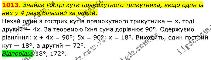 Знайди гострі кути прямокутного трикутника, якщо один із них у 4 рази більший за інший. Нехай один з гострих кутів прямокутного трикутника — х, тоді другий — 4х. За теоремою їхня сума дорівнює 90°. Одержуємо рівняння: х + 4х = 90°; 5х = 90°; х = 18°. Виходить, один гострий кут — 18°, а другий — 72°. Відповідь: 18°, 172°.
