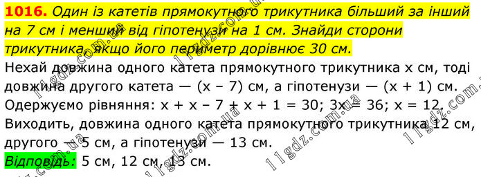 Один із катетів прямокутного трикутника більший за інший на 7 см і менший від гіпотенузи на 1 см. Знайди сторони трикутника, якщо його периметр дорівнює 30 см. Нехай довжина одного катета прямокутного трикутника х см, тоді довжина другого катета — (х – 7) см, а гіпотенузи — (х + 1) см. Одержуємо рівняння: х + х – 7 + х + 1 = 30; 3х = 36; х = 12. Виходить, довжина одного катета прямокутного трикутника 12 см, другого — 5 см, а гіпотенузи — 13 см. Відповідь: 5 см, 12 см, 13 см.