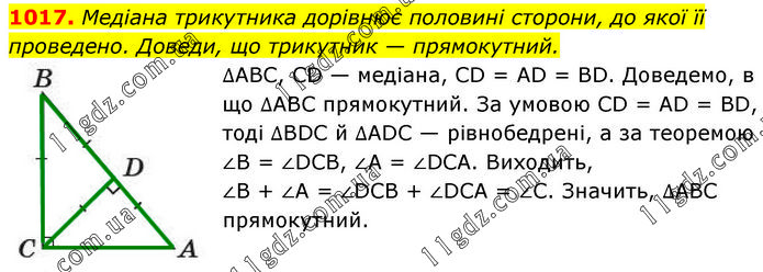 Медіана трикутника дорівнює половині сторони, до якої її проведено. Доведи, що трикутник — прямокутний. ∆ABC, CD — медіана, CD = AD = BD. Доведемо, в що ∆ABC прямокутний. За умовою CD = AD = BD, тоді ∆BDC й ∆ADC — рівнобедрені, а за теоремою ∠B = ∠DCB, ∠A = ∠DCA. Виходить, ∠В + ∠А = ∠DCB + ∠DCA = ∠C. Значить, ∆ABC прямокутний.