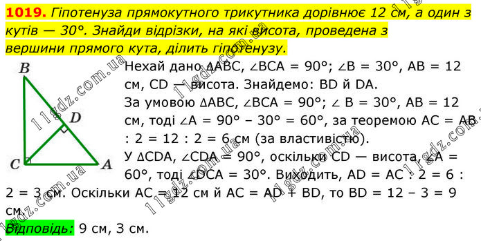 Гіпотенуза прямокутного трикутника дорівнює 12 см, а один з кутів — 30°. Знайди відрізки, на які висота, проведена з вершини прямого кута, ділить гіпотенузу. Нехай дано ∆ABC, ∠BCA = 90°; ∠B = 30°, AB = 12 см, CD — висота. Знайдемо: BD й DA. За умовою ∆ABC, ∠BCA = 90°; ∠ B = 30°, AB = 12 см, тоді ∠A = 90° – 30° = 60°, за теоремою AC = AB : 2 = 12 : 2 = 6 см (за властивістю). У ∆CDA, ∠CDA = 90°, оскільки CD — висота, ∠A = 60°, тоді ∠DCA = 30°. Виходить, AD = AC : 2 = 6 : 2 = 3 см. Оскільки AC = 12 см й AC = AD + BD, то BD = 12 – 3 = 9 см. Відповідь: 9 см, З см.