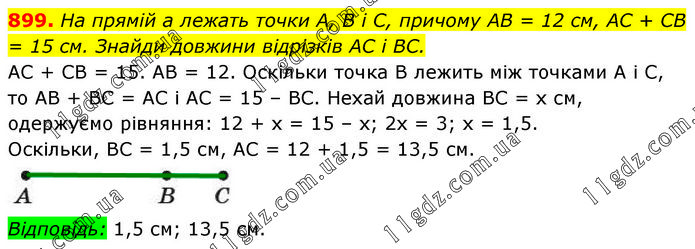 На прямій a лежать точки A, B і C, причому AB = 12 см, AC + CB = 15 см. Знайди довжини відрізків AC і BC. AC + CB = 15. AB = 12. Оскільки точка В лежить між точками А і С, то AB + BC = AC і AC = 15 – BC. Нехай довжина BC = х см, одержуємо рівняння: 12 + х = 15 – х; 2х = 3; х = 1,5. Оскільки, BC = 1,5 см, AC = 12 + 1,5 = 13,5 см. Відповідь: 1,5 см; 13,5 см.