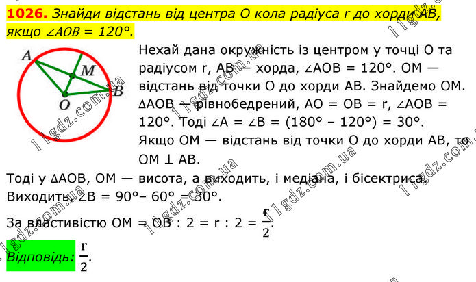 Знайди відстань від центра O кола радіуса r до хорди AB, якщо ∠AOB = 120°. Нехай дана окружність із центром у точці O та радіусом r, AB — хорда, ∠AOB = 120°. OM — відстань від точки O до хорди AB. Знайдемо ОМ. ∆AOB — рівнобедрений, AO = OB = r, ∠AOB = 120°. Тоді ∠A = ∠B = (180° – 120°) = 30°. Якщо OM — відстань від точки O до хорди AB, то OM ⊥ AB. Тоді у ∆AOB, OM — висота, а виходить, і медіана, і бісектриса. Виходить, ∠B = 90°– 60° = 30°. За властивістю ОМ = ОВ : 2 = r : 2 = r/2. Відповідь: r/2.