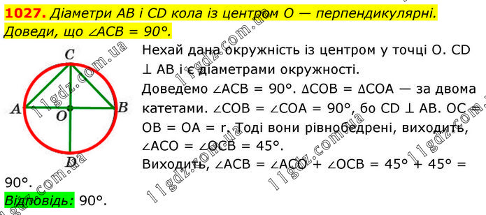 Діаметри AB і CD кола із центром O — перпендикулярні. Доведи, що ∠ACB = 90°. Нехай дана окружність із центром у точці О. CD ⊥ AB і є діаметрами окружності. Доведемо ∠ACB = 90°. ∆СОВ = ∆COA — за двома катетами. ∠COB = ∠COА = 90°, бо CD ⊥ AB. ОС = ОВ = ОА = r. Тоді вони рівнобедрені, виходить, ∠ACO = ∠OCB = 45°. Виходить, ∠ACB = ∠ACO + ∠OCB = 45° + 45° = 90°. Відповідь: 90°.