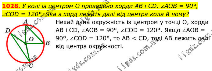 У колі із центром O проведено хорди AB і CD. ∠AOB = 90°, ∠COD = 120°. Яка з хорд лежить далі від центра кола й чому? Нехай дана окружність із центром у точці О, хорди AB і CD, ∠AOB = 90°, ∠COD = 120°. Якщо ∠AOB = 90°, ∠COD = 120°, то AB < CD, тоді AB лежить далі від центра окружності.