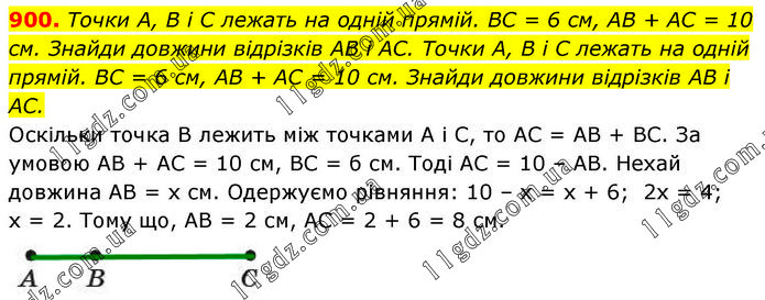 Точки A, B і C лежать на одній прямій. BC = 6 см, AB + AC = 10 см. Знайди довжини відрізків AB і AC. Точки A, B і C лежать на одній прямій. BC = 6 см, AB + AC = 10 см. Знайди довжини відрізків AB і AC. Оскільки точка В лежить між точками А і С, то AC = AB + BC. За умовою AB + AC = 10 см, BC = б см. Тоді AC = 10 – AB. Нехай довжина АВ = х см. Одержуємо рівняння: 10 – х = х + 6; 2х = 4; х = 2. Тому що, AB = 2 см, AC = 2 + 6 = 8 см.