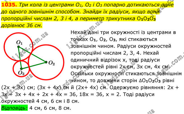 Три кола із центрами O1, O2 і O3 попарно дотикаються одне до одного зовнішнім способом. Знайди їх радіуси, якщо вони пропорційні числам 2, 3 і 4, а периметр трикутника O1O2O3 дорівнює 36 см. Нехай дані три окружності із центрами в точках O1, О2, О3, які стикаються зовнішнім чином. Радіуси окружностей пропорційні числам 2, З, 4. Нехай одиничний відрізок х, тоді радіуси окружностей рівні 2х см, Зх см, 4х см. Оскільки окружності стикаються зовнішнім чином, то довжини сторін ∆O1O2O3 рівні (2х + Зх) см; (Зх + 4х) см й (2х+ 4х) см. Одержуємо рівняння: 2х + 3х + 3х + 4х + 2х + 4х = 36, 18х = 36, х = 2. Тоді радіуси окружностей 4 см, 6 см і 8 см. Відповідь: 4 см, 6 см, 8 см.
