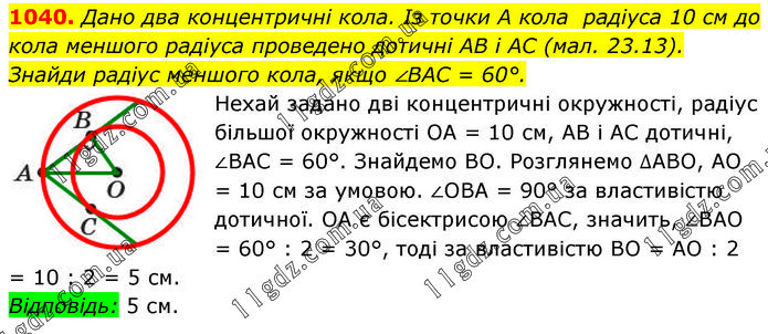 Дано два концентричні кола. Із точки A кола радіуса 10 см до кола меншого радіуса проведено дотичні AB і AC (мал. 23.13). Знайди радіус меншого кола, якщо ∠BAC = 60°. Нехай задано дві концентричні окружності, радіус більшої окружності OA = 10 см, AB і AC дотичні, ∠BAC = 60°. Знайдемо BO. Розглянемо ∆ABO, AO = 10 cм за умовою. ∠OBA = 90° за властивістю дотичної. OA є бісектрисою ∠BAC, значить, ∠BAO = 60° : 2 = 30°, тоді за властивістю BO = AO : 2 = 10 : 2 = 5 см. Відповідь: 5 см.