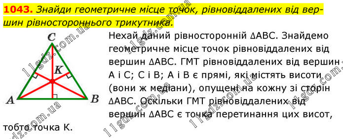 Знайди геометричне місце точок, рівновіддалених від вершин рівностороннього трикутника. Нехай даний рівносторонній ∆ABC. Знайдемо геометричне місце точок рівновіддалених від вершин ∆ABC. ГМТ рівновіддалених від вершин A і С; C і В; A i B є прямі, які містять висоти (вони ж медіани), опущені на кожну зі сторін ∆ABC. Оскільки ГМТ рівновіддалених від вершин ∆ABC є точка перетинання цих висот, тобто точка К.