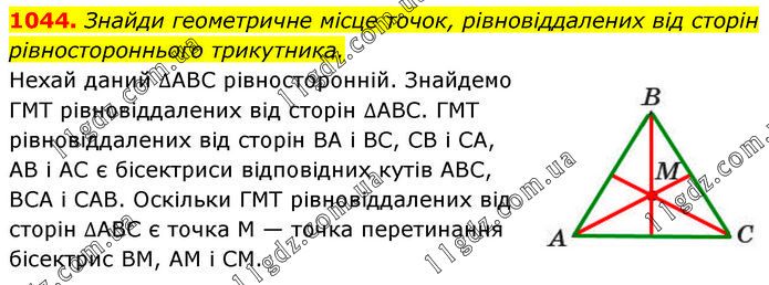 Знайди геометричне місце точок, рівновіддалених від сторін рівностороннього трикутника. Нехай даний ∆ABC рівносторонній. Знайдемо ГМТ рівновіддалених від сторін ∆ABC. ГМТ рівновіддалених від сторін BA і BC, CB і CA, AB і AC є бісектриси відповідних кутів ABC, BCA і САВ. Оскільки ГМТ рівновіддалених від сторін ∆ABC є точка M — точка перетинання бісектрис BM, AM і CM.