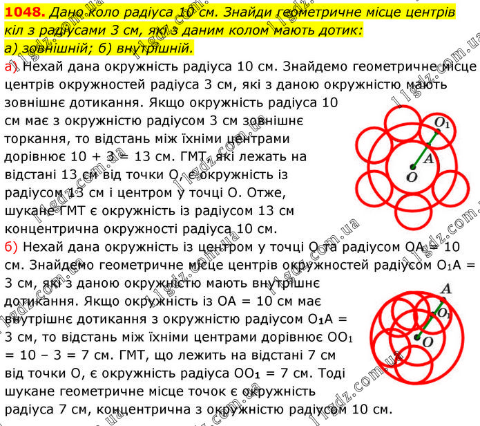 Дано коло радіуса 10 см. Знайди геометричне місце центрів кіл з радіусами 3 см, які з даним колом мають дотик: а) зовнішній; б) внутрішній. а) Нехай дана окружність радіуса 10 см. Знайдемо геометричне місце центрів окружностей радіуса 3 см, які з даною окружністю мають зовнішнє дотикання. Якщо окружність радіуса 10 см має з окружністю радіусом 3 см зовнішнє торкання, то відстань між їхніми центрами дорівнює 10 + 3 = 13 см. ГМТ, які лежать на відстані 13 см від точки О, є окружність із радіусом 13 см і центром у точці О. Отже, шукане ГМТ є окружність із радіусом 13 см концентрична окружності радіуса 10 см. б) Нехай дана окружність із центром у точці O та радіусом OA = 10 см. Знайдемо геометричне місце центрів окружностей радіусом O1A = 3 см, які з даною окружністю мають внутрішнє дотикання. Якщо окружність із OA = 10 см має внутрішнє дотикання з окружністю радіусом O1A = 3 см, то відстань між їхніми центрами дорівнює OO1 = 10 – 3 = 7 см. ГМТ, що лежить на відстані 7 см від точки О, є окружність радіуса OO1 = 7 см. Тоді шукане геометричне місце точок є окружність радіуса 7 см, концентрична з окружністю радіусом 10 см.