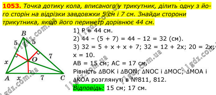 Точка дотику кола, вписаного у трикутник, ділить одну з його сторін на відрізки завдовжки 5 см і 7 см. Знайди сторони трикутника, якщо його периметр дорівнює 44 см. 1) P = 44 см. 2) 44 – (5 + 7) = 44 – 12 = 32 (см). 3) 32 = 5 + х + х + 7; 32 = 12 + 2х; 20 = 2х; х = 10. AB = 15 см; AC = 17 см. Рівність ∆BOK і ∆BON; ∆NOC і ∆MOC; ∆MOA і ∆KOA розглянуті в №811, 812. Відповідь: 15 см; 17 см.