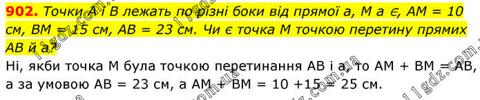 Точки A і B лежать по різні боки від прямої a, M a ∈, AM = 10 см, BM = 15 см, AB = 23 см. Чи є точка M точкою перетину прямих AB й a? Ні, якби точка M була точкою перетинання AB і а, то AM + BM = AB, а за умовою AB = 23 см, а AM + BM = 10 + 15 = 25 см.