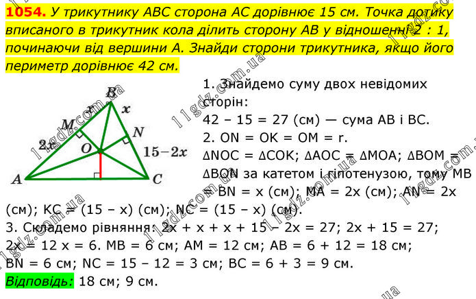 У трикутнику ABC сторона AC дорівнює 15 см. Точка дотику вписаного в трикутник кола ділить сторону AB у відношенні 2 : 1, починаючи від вершини A. Знайди сторони трикутника, якщо його периметр дорівнює 42 см. 1. Знайдемо суму двох невідомих сторін: 42 – 15 = 27 (см) — сума AB і BC. 2. ON = OK = OM = r. ∆NOC = ∆COK; ∆AOC = ∆MOA; ∆BOM = ∆BON за катетом і гіпотенузою, тому MB = BN = х (см); MA = 2х (см); AN = 2х (см); KC = (15 – x) (см); NC = (15 – х) (см). 3. Складемо рівняння: 2х + х + х + 15 – 2х = 27; 2х + 15 = 27; 2х = 12 х = 6. MB = 6 см; AM = 12 см; AB = 6 + 12 = 18 см; BN = 6 см; NC = 15 – 12 = 3 см; BC = 6 + 3 = 9 см. Відповідь: 18 см; 9 см.