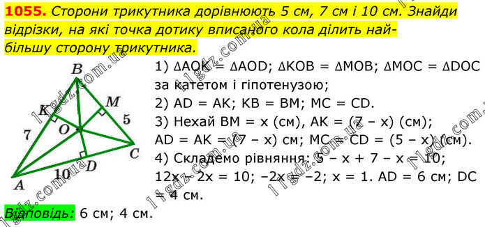 Сторони трикутника дорівнюють 5 см, 7 см і 10 см. Знайди відрізки, на які точка дотику вписаного кола ділить найбільшу сторону трикутника. 1) ∆AOK = ∆AOD; ∆KOB = ∆МОВ; ∆MOC = ∆DOC за катетом і гіпотенузою; 2) AD = AK; KB = BM; MC = CD. 3) Нехай ВМ = х (см), AK = (7 – х) (см); AD = AK = (7 – х) см; MC = CD = (5 – х) (см). 4) Складемо рівняння: 5 – х + 7 – х = 10; 12х – 2х = 10; –2х = –2; х = 1. AD = 6 см; DC = 4 см. Відповідь: 6 см; 4 см.