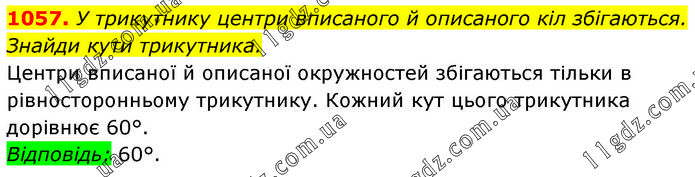 У трикутнику центри вписаного й описаного кіл збігаються. Знайди кути трикутника. Центри вписаної й описаної окружностей збігаються тільки в рівносторонньому трикутнику. Кожний кут цього трикутника дорівнює 60°. Відповідь: 60°.