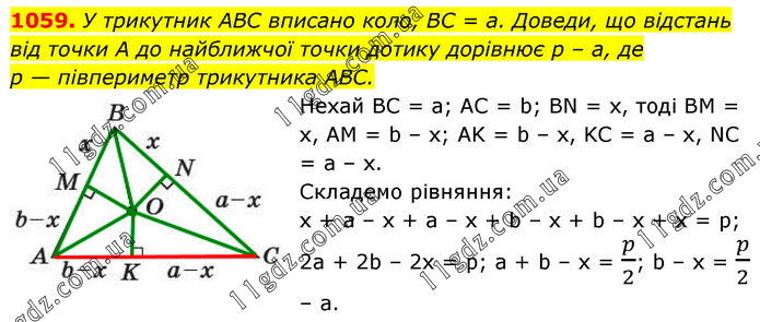 У трикутник ABC вписано коло, BC = a. Доведи, що відстань від точки A до найближчої точки дотику дорівнює p – a, де p — півпериметр трикутника ABC. Нехай BC = а; AC = b; BN = х, тоді BM = х, AM = b – x; AK = b – x, KC = а – х, NC = а – х. Складемо рівняння: x + a – x + a – x + b – x + b – x + x = р; 2а + 2b – 2х = р; a + b – х = p/2; b – х = p/2 – a.