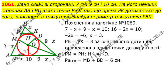 Дано ∆ABC зі сторонами 7 см, 9 см і 10 см. На його менших сторонах AB і BC взято точки P і K так, що пряма PK дотикається до кола, вписаного в трикутник. Знайди периметр трикутника PBK. Пояснення аналогічне №1060. 7 – х + 9 – х = 10; 16 – 2х = 10; –2х = –6; х = 3. PB = PK = 3 за властивістю дотичної, проведеної з однієї точки до окружності: PM = PH; HK = KD. P∆PBK = MB + BD = 6 см.