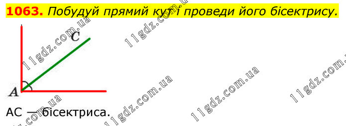 Побудуй прямий кут і проведи його бісектрису. AC — бісектриса.