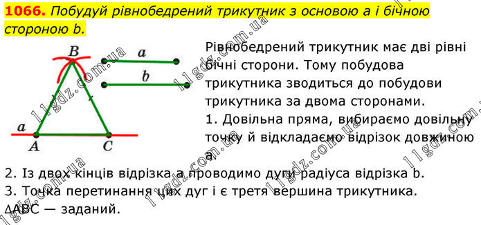 Побудуй рівнобедрений трикутник з основою a і бічною стороною b. Рівнобедрений трикутник має дві рівні бічні сторони. Тому побудова трикутника зводиться до побудови трикутника за двома сторонами. 1. Довільна пряма, вибираємо довільну точку й відкладаємо відрізок довжиною а. 2. Із двох кінців відрізка а проводимо дуги радіуса відрізка b. 3. Точка перетинання цих дуг і є третя вершина трикутника. ∆ABC — заданий.