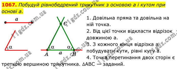 Побудуй рівнобедрений трикутник з основою a і кутом при основі a. 1. Довільна пряма та довільна на ній точка. 2. Від цієї точки відкласти відрізок довжиною а. 3. З кожного кінця відрізка а побудувати кути, рівні куту а. 4. Точка перетинання двох сторін є третьою вершиною трикутника. ∆ABC — заданий.