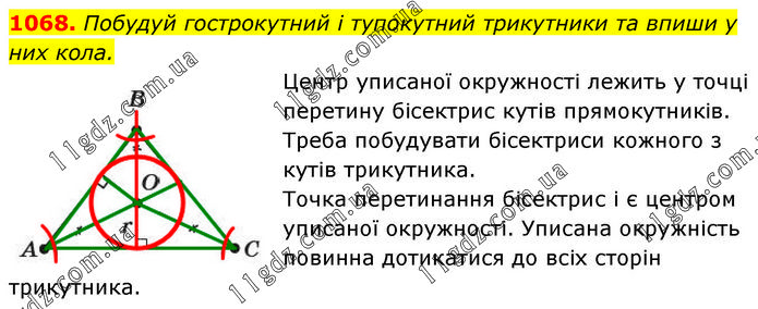 Побудуй гострокутний і тупокутний трикутники та впиши у них кола. Центр уписаної окружності лежить у точці перетину бісектрис кутів прямокутників. Треба побудувати бісектриси кожного з кутів трикутника. Точка перетинання бісектрис і є центром уписаної окружності. Уписана окружність повинна дотикатися до всіх сторін трикутника.