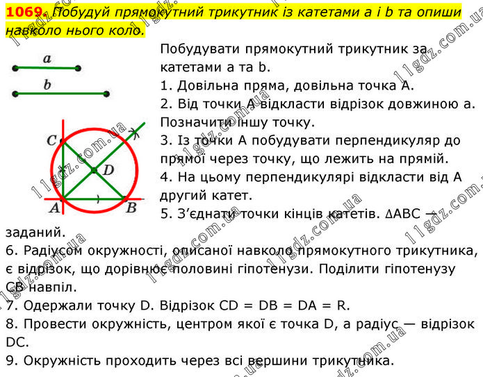 Побудуй прямокутний трикутник із катетами a і b та опиши навколо нього коло. Побудувати прямокутний трикутник за катетами а та b. 1. Довільна пряма, довільна точка А. 2. Від точки А відкласти відрізок довжиною а. Позначити іншу точку. 3. Із точки А побудувати перпендикуляр до прямої через точку, що лежить на прямій. 4. На цьому перпендикулярі відкласти від А другий катет. 5. З’єднати точки кінців катетів. ∆ABC — заданий. 6. Радіусом окружності, описаної навколо прямокутного трикутника, є відрізок, що дорівнює половині гіпотенузи. Поділити гіпотенузу CB навпіл. 7. Одержали точку D. Відрізок CD = DB = DA = R. 8. Провести окружність, центром якої є точка D, а радіус — відрізок DC. 9. Окружність проходить через всі вершини трикутника.
