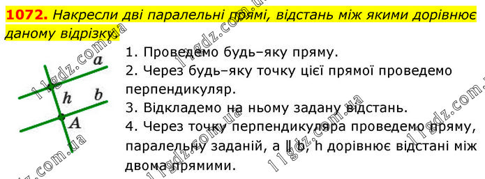 Накресли дві паралельні прямі, відстань між якими дорівнює даному відрізку. 1. Проведемо будь–яку пряму. 2. Через будь–яку точку цієї прямої проведемо перпендикуляр. 3. Відкладемо на ньому задану відстань. 4. Через точку перпендикуляра проведемо пряму, паралельну заданій, а ∥ b, h дорівнює відстані між двома прямими.
