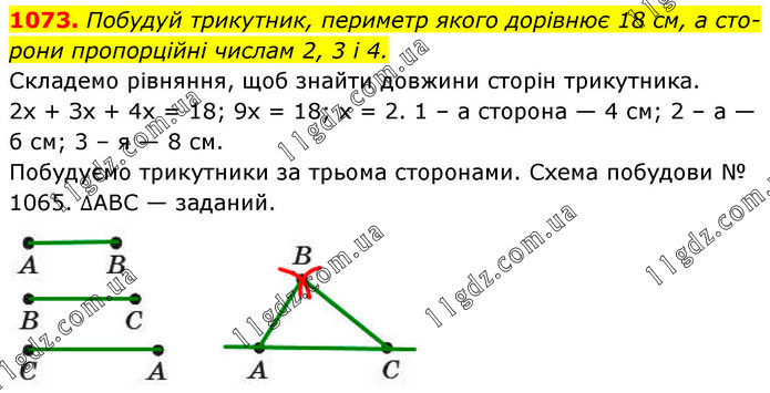 Побудуй трикутник, периметр якого дорівнює 18 см, а сторони пропорційні числам 2, 3 і 4. Складемо рівняння, щоб знайти довжини сторін трикутника. 2х + Зх + 4х = 18; 9х = 18; х = 2. 1 – а сторона — 4 см; 2 – а — б см; 3 – я — 8 см. Побудуємо трикутники за трьома сторонами. Схема побудови № 1065. ∆ABC — заданий.