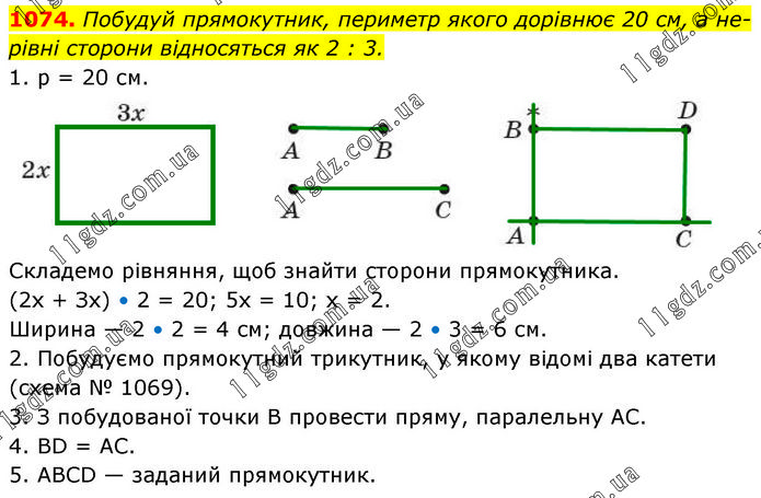 Побудуй прямокутник, периметр якого дорівнює 20 см, а нерівні сторони відносяться як 2 : 3. 1. р = 20 см. Складемо рівняння, щоб знайти сторони прямокутника. (2х + Зх) • 2 = 20; 5х = 10; х = 2. Ширина — 2 • 2 = 4 см; довжина — 2 • 3 = 6 см. 2. Побудуємо прямокутний трикутник, у якому відомі два катети (схема № 1069). 3. З побудованої точки В провести пряму, паралельну AC. 4. BD = AC. 5. ABCD — заданий прямокутник.