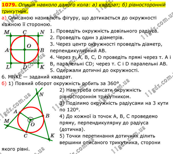 Опиши навколо даного кола: а) квадрат; б) рівносторонній трикутник. а) Описаною називають фігуру, що дотикається до окружності кожною її стороною. 1. Проведіть окружність довільного радіуса. 2. Проведіть один з діаметрів. 3. Через центр окружності проведіть діаметр, перпендикулярний AB. 4. Через т. А, В, С, D проведіть прямі через т. А і В, паралельні CD; через т. C і D паралельні AB. 5. Одержали дотичні до окружності. 6. MNKL — заданий квадрат. б) 1) Повний оборот окружність робить за 360°. 2) Нам треба описати окружність рівностороннім трикутником. 3) Поділимо окружність радіусами на 3 кути по 120°. 4) До кожної із точок А, В, C проведемо пряму, перпендикулярну до радіуса (дотична). 5) Точки перетинання дотичних ділить вершини описаного трикутника, сторони якого рівні.