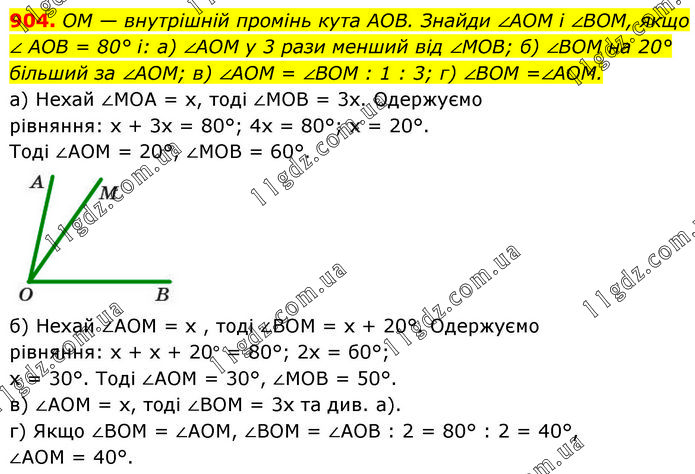 OM — внутрішній промінь кута AOB. Знайди ∠AOM і ∠BOM, якщо ∠ AOB = 80° і: а) ∠AOM у 3 рази менший від ∠MOB; б) ∠BOM на 20° більший за ∠AOM; в) ∠AOM = ∠BOM : 1 : 3; г) ∠BOM =∠AOM. а) Нехай ∠MOA = х, тоді ∠MOB = 3x. Одержуємо рівняння: х + 3х = 80°; 4х = 80°; х = 20°. Тоді ∠AOM = 20°, ∠MOB = 60°. б) Нехай ∠AOM = х , тоді ∠BOM = х + 20°. Одержуємо рівняння: х + х + 20° = 80°; 2х = б0°; х = 30°. Тоді ∠AOM = 30°, ∠MOB = 50°. в) ∠AOM = х, тоді ∠BOM = 3x та див. а). г) Якщо ∠BOM = ∠AOM, ∠BOM = ∠AOB : 2 = 80° : 2 = 40°, ∠AOM = 40°.