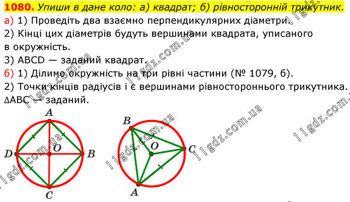 Упиши в дане коло: а) квадрат; б) рівносторонній трикутник. а) 1) Проведіть два взаємно перпендикулярних діаметри. 2) Кінці цих діаметрів будуть вершинами квадрата, уписаного в окружність. 3) ABCD — заданий квадрат. б) 1) Ділимо окружність на три рівні частини (№ 1079, б). 2) Точки кінців радіусів і є вершинами рівностороннього трикутника. ∆ABC — заданий.