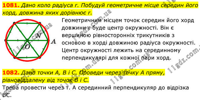 1081. Дано коло радіуса r. Побудуй геометричне місце середин його хорд, довжина яких дорівнює r. Геометричним місцем точок середин його хорд довжини r буде центр окружності. Він є вершиною рівносторонніх трикутників з основою в хорді довжиною радіуса окружності. Центр окружності лежить на серединному перпендикулярі для кожної пари хорд. 1082. Дано точки A, B і C. Проведи через точку A пряму, рівновіддалену від точок B і C. Треба провести через т. А серединний перпендикуляр до відрізка BC.