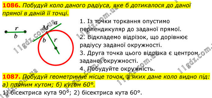 1086. Побудуй коло даного радіуса, яке б дотикалося до даної прямої в даній її точці. 1. Із точки торкання опустимо перпендикуляр до заданої прямої. 2. Відкладемо відрізок, що дорівнює радіусу заданої окружності. 3. Друга точка цього відрізка є центром заданої окружності. 4. Побудуйте окружність. 1087. Побудуй геометричне місце точок, з яких дане коло видно під: а) прямим кутом; б) кутом 60°. 1) бісектриса кута 90°; 2) бісектриса кута 60°.