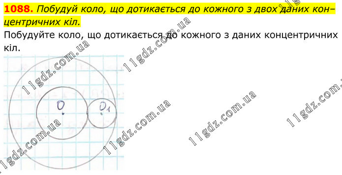 Побудуй коло, що дотикається до кожного з двох даних кон– центричних кіл. Побудуйте коло, що дотикається до кожного з даних концентричних кіл.