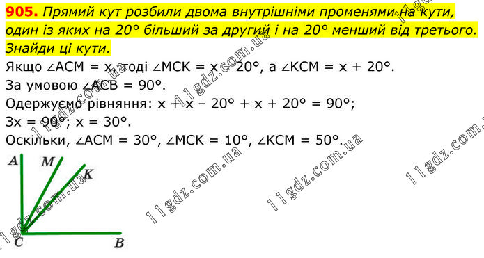 Прямий кут розбили двома внутрішніми променями на кути, один із яких на 20° більший за другий і на 20° менший від третього. Знайди ці кути. Якщо ∠ACM = х, тоді ∠MCK = х – 20°, a ∠KCM = х + 20°. За умовою ∠ACB = 90°. Одержуємо рівняння: х + х – 20° + х + 20° = 90°; Зх = 90°; х = 30°. Оскільки, ∠ACM = 30°, ∠MCK = 10°, ∠KCM = 50°.