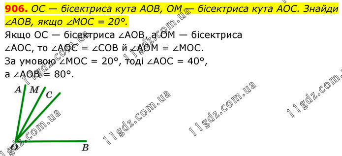 OC — бісектриса кута AOB, OM — бісектриса кута AOC. Знайди ∠AOB, якщо ∠MOC = 20°. Якщо OC — бісектриса ∠AOB, a OM — бісектриса ∠AOC, то ∠AOC = ∠COB й ∠AOM = ∠MOC. За умовою ∠MOC = 20°, тоді ∠AOC = 40°, a ∠AOB = 80°.
