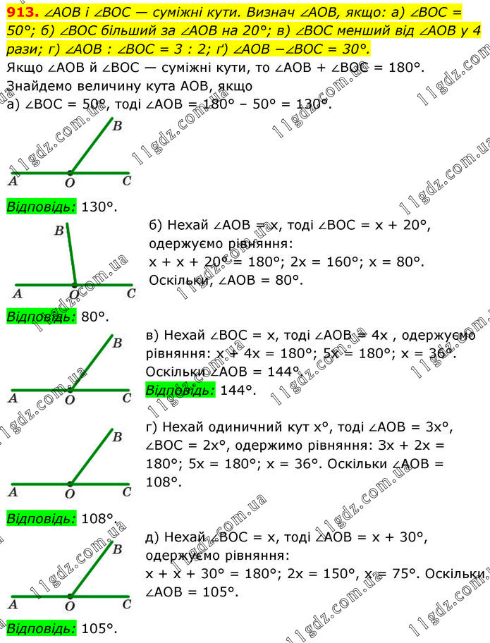 ∠AOB і ∠BOC — суміжні кути. Визнач ∠AOB, якщо: а) ∠BOC = 50°; б) ∠BOC більший за ∠AOB на 20°; в) ∠BOC менший від ∠AOB у 4 рази; г) ∠AOB : ∠BOC = 3 : 2; ґ) ∠AOB −∠BOC = 30°. Якщо ∠AOB й ∠BOC — суміжні кути, то ∠AOB + ∠BOC = 180°. Знайдемо величину кута АОВ, якщо а) ∠BOC = 50°, тоді ∠AOB = 180° – 50° = 130°. Відповідь: 130°. б) Нехай ∠AOB = х, тоді ∠BOC = х + 20°, одержуємо рівняння: х + х + 20° = 180°; 2х = 160°; х = 80°. Оскільки, ∠AOB = 80°. Відповідь: 80°. в) Нехай ∠BOC = х, тоді ∠AOB = 4x , одержуємо рівняння: x + 4x = 180°; 5х = 180°; х = 36°. Оскільки ∠AOB = 144°. Відповідь: 144°. г) Нехай одиничний кут х°, тоді ∠AOB = 3x°, ∠BOC = 2х°, одержимо рівняння: Зх + 2х = 180°; 5х = 180°; х = 36°. Оскільки ∠AOB = 108°. Відповідь: 108°. д) Нехай ∠BOC = х, тоді ∠AOB = х + 30°, одержуємо рівняння: х + х + 30° = 180°; 2х = 150°, х = 75°. Оскільки ∠AOB = 105°. Відповідь: 105°.