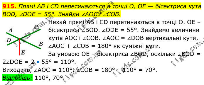 Прямі AB і CD перетинаються в точці O, OE — бісектриса кута BOD, ∠DOE = 55°. Знайди ∠AOC і ∠COB. Нехай прямі AB і CD перетинаються в точці О. OE – бісектриса ∠BOD. ∠ODE = 55°. Знайдемо величини кутів AOC і ∠COB. ∠AOC = ∠DOВ вертикальні кути, ∠AOC + ∠COB = 180° як суміжні кути. За умовою OE – бісектриса ∠BOD, оскільки ∠BOD = 2∠DOE = 2 • 55° = 110°. Виходить, ∠AOC = 110°, ∠COB = 180° – 110° = 70°. Відповідь: 110°, 70°.