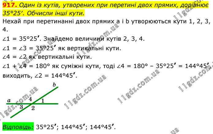 Один із кутів, утворених при перетині двох прямих, дорівнює 35°25′. Обчисли інші кути. Нехай при перетинанні двох прямих а і b утворюються кути 1, 2, 3, 4. ∠1 = 35°25’. Знайдемо величини кутів 2, 3, 4. ∠1 = ∠3 = 35°25’ як вертикальні кути. ∠4 = ∠2 як вертикальні кути. ∠1 + ∠4 = 180° як суміжні кути, тоді ∠4 = 180° – 35°25’ = 144°45’, виходить, ∠2 = 144°45’. Відповідь: 35°25’; 144°45’; 144°45’.