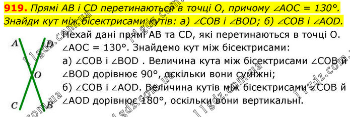 Прямі AB і CD перетинаються в точці O, причому ∠AOC = 130°. Знайди кут між бісектрисами кутів: а) ∠COB і ∠BOD; б) ∠COB і ∠AOD. Нехай дані прямі AB та CD, які перетинаються в точці О. ∠AOC = 130°. Знайдемо кут між бісектрисами: а) ∠COB і ∠BOD . Величина кута між бісектрисами ∠COB й ∠BOD дорівнює 90°, оскільки вони суміжні; б) ∠СОВ і ∠AOD. Величина кутів між бісектрисами ∠COB й ∠AOD дорівнює 180°, оскільки вони вертикальні.