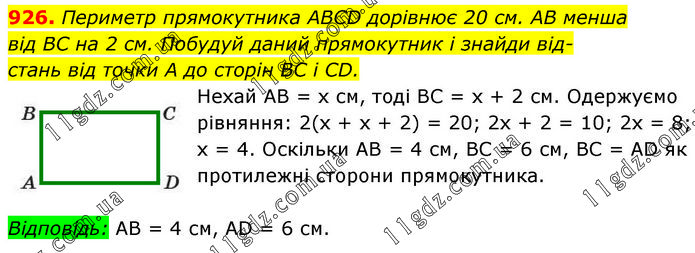 Периметр прямокутника ABCD дорівнює 20 см. AB менша від BC на 2 см. Побудуй даний прямокутник і знайди відстань від точки A до сторін BC і CD. Нехай АВ = х см, тоді ВС = х + 2 см. Одержуємо рівняння: 2(х + х + 2) = 20; 2х + 2 = 10; 2х = 8; х = 4. Оскільки AB = 4 см, BC = 6 см, BC = AD як протилежні сторони прямокутника. Відповідь: AB = 4 см, AD = 6 см.